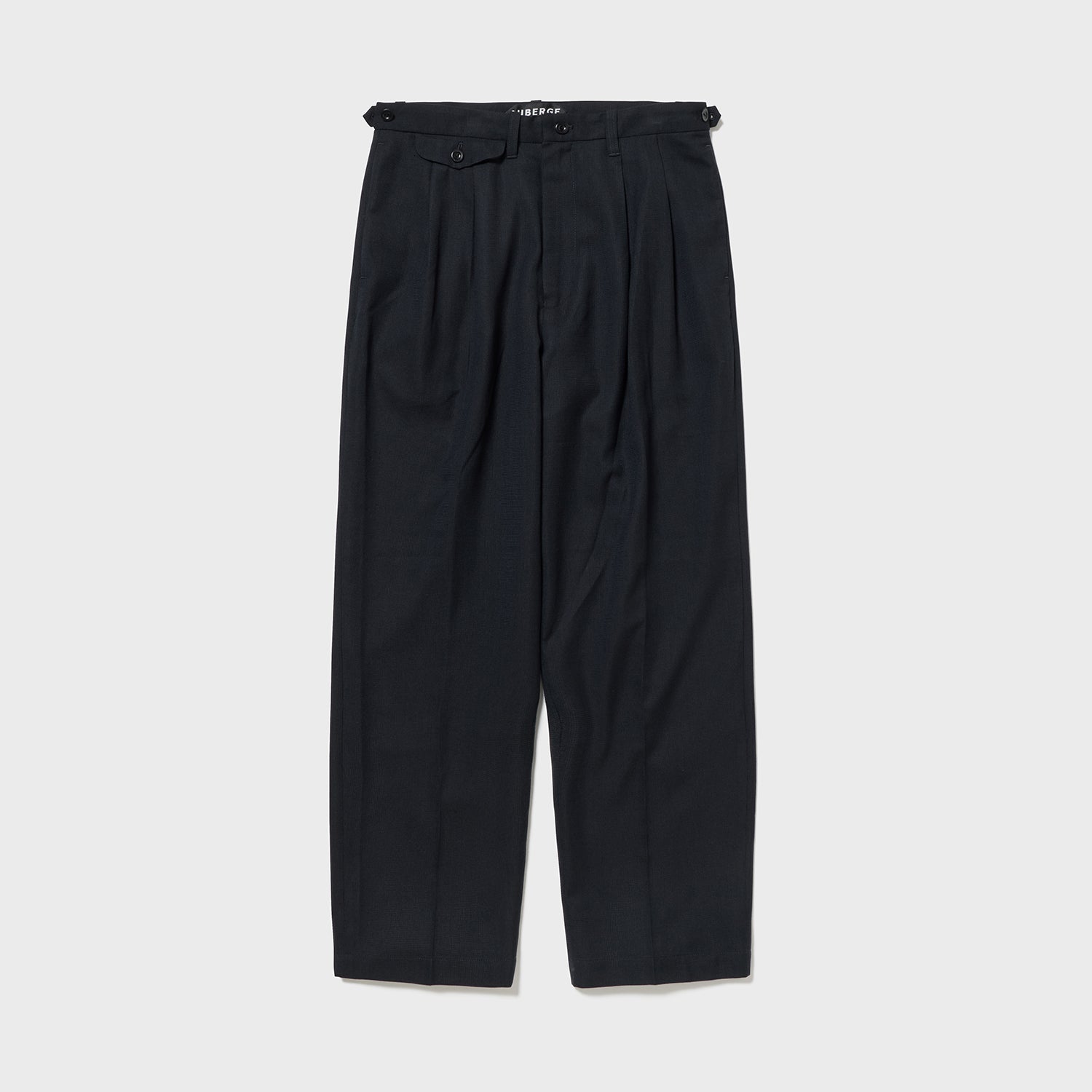 イギリスCC41時代のスラックスから後ろベルトにサイズアジャストのゴムが入る極めて珍しいスラックスを入手、採用した。これにより1サイズ上下にサイズを変えることが出来、戦時中の物の少ない時代のアイデアと思います。当時の流行だったのか、ほぼ何も入らないのに付いているビッグフラップなコインポケットも、もちろん装備。