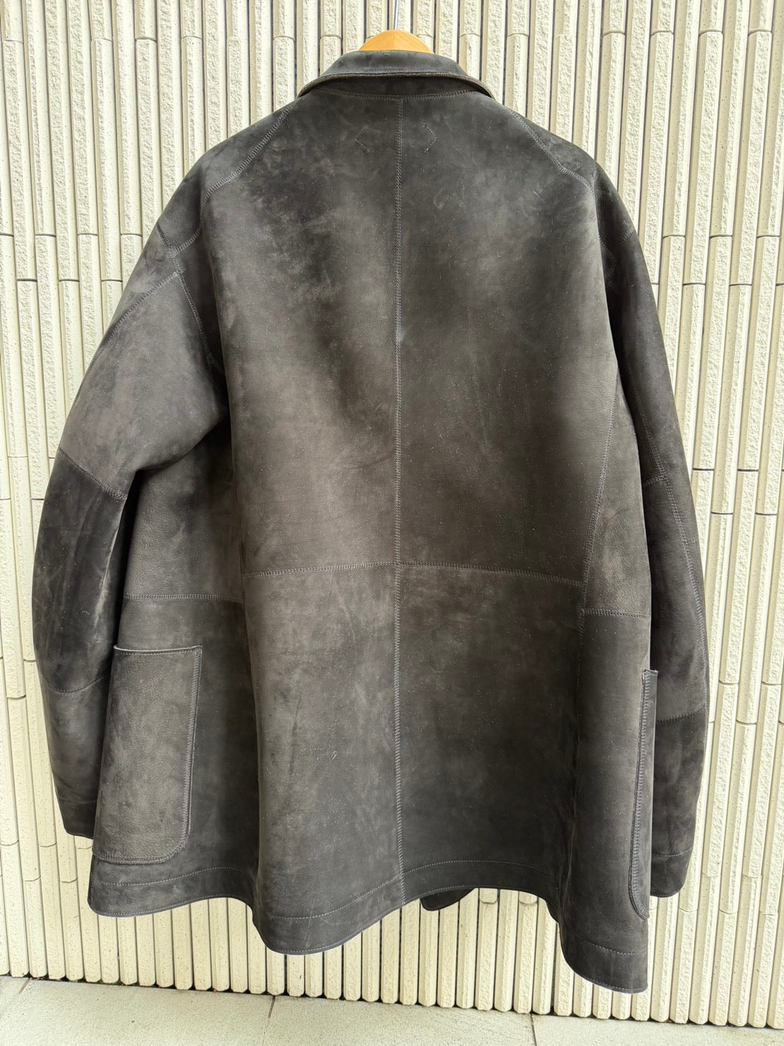 日本に3工場しかない縫い代0で縫い合わせる特殊ミシンで仕立てたAUBERGE定番アジェ型19世紀サックコート。レザー縫製の世界で前例のない技法。もはや大人は固く、重いレザーは選びにくいが柔らかすぎるシープやカーフではいわゆるのハイブランドレザーになってしまう。そこで柔らかさの究極、ベビーカーフに尾州のウールスムースをボンディングで柔らかさがあるのにハリがある状況を作り、分量の入ったヴィンテージサックコート(ジャケット)でえも言えぬモード感を演出、大人も納得の軽さ柔らかさも併せ持つ1着に仕上げた。