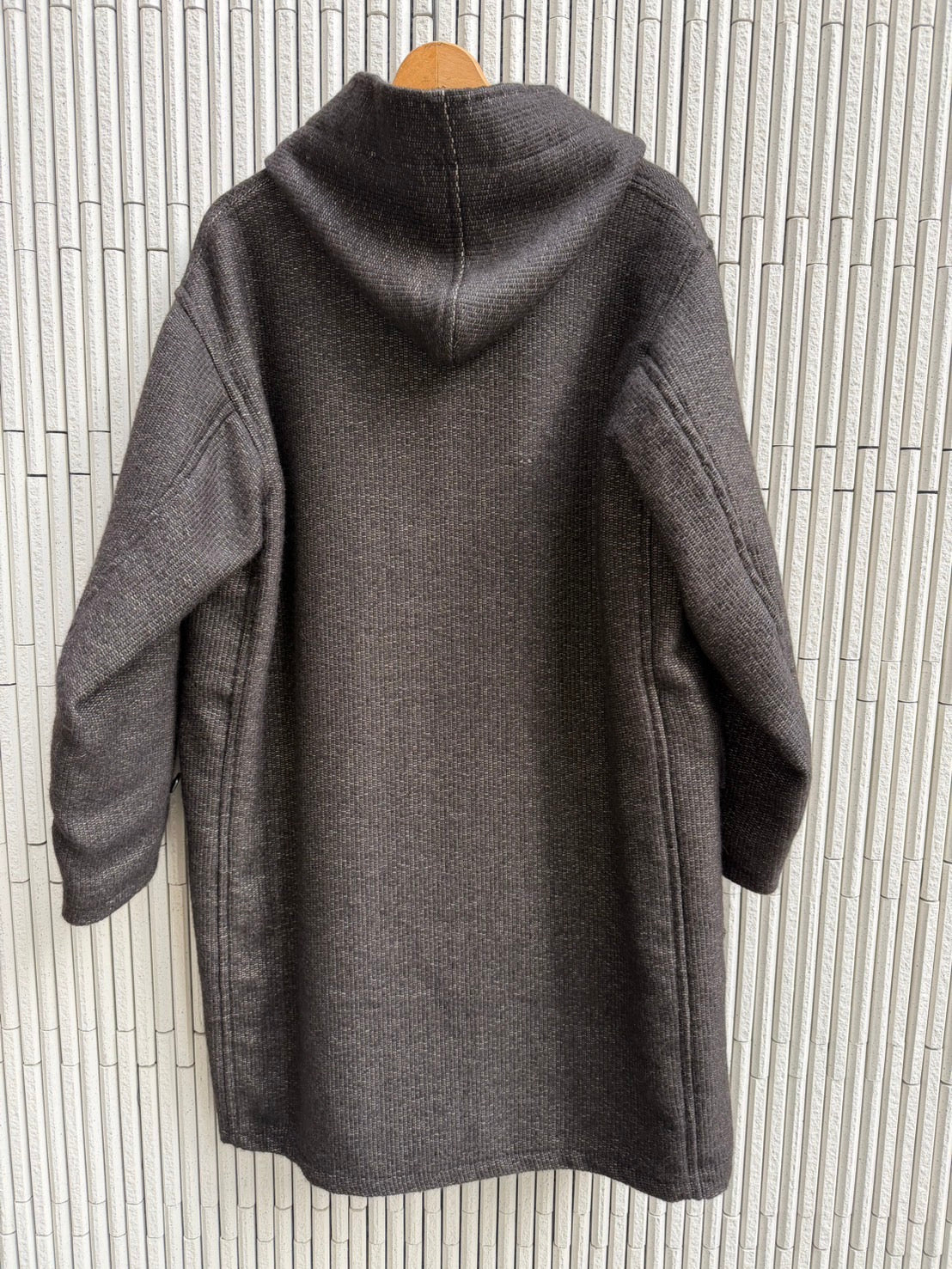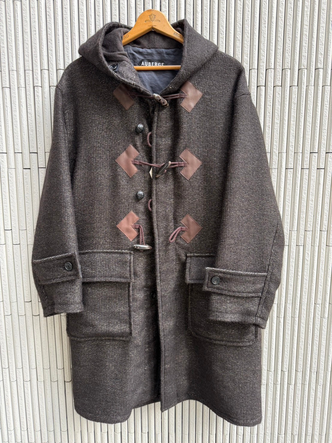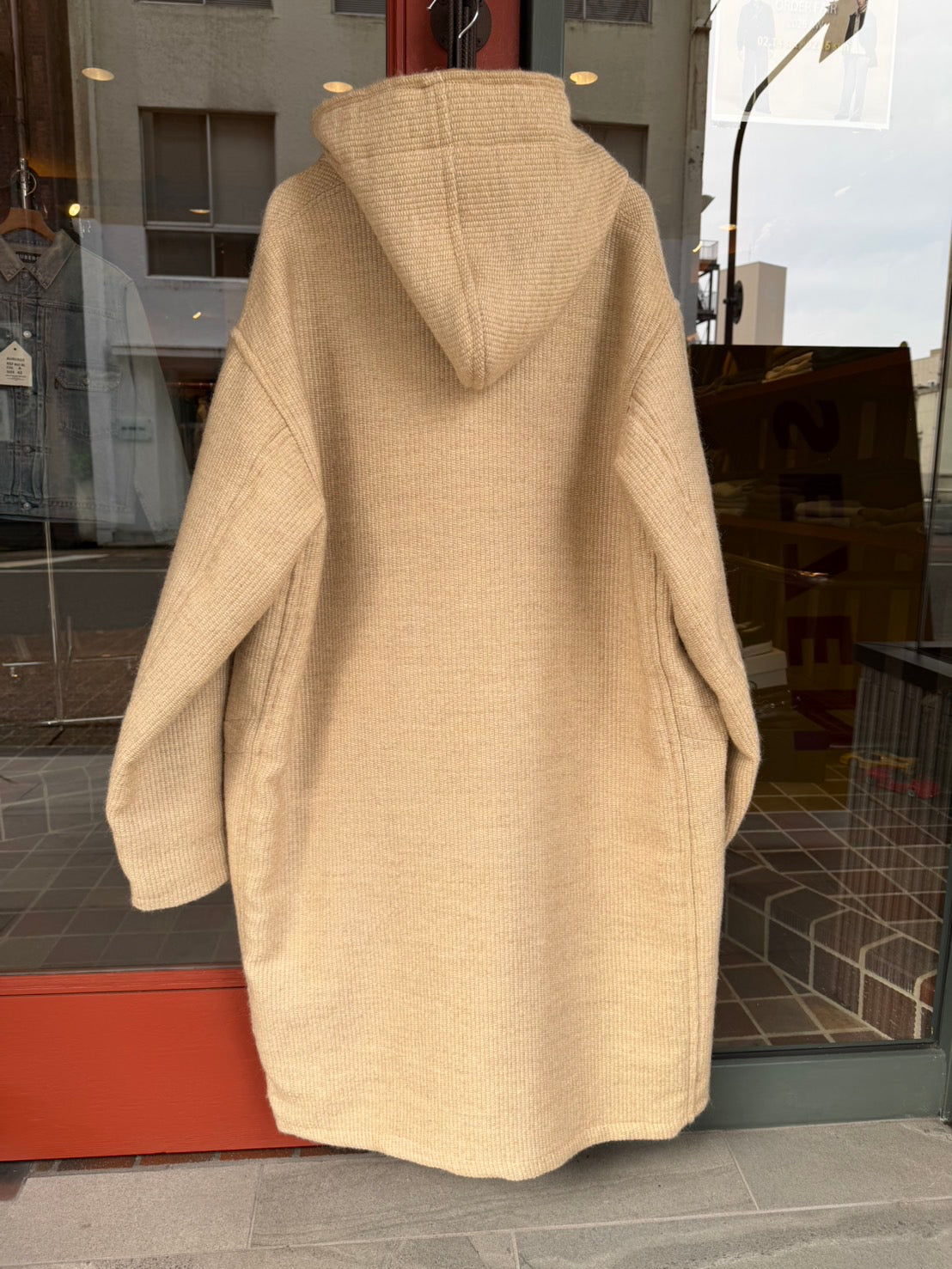 80年代後半にリリースされたH社のダッフルをオマージュ。今回の獣毛チマヨは横に張らずに落ちるので、ドロップショルダーの本作を相性が最高であった。我々から見てダッフルの失敗例は横張りして巨大冷蔵庫のようになってしまうことで、日本で老舗ダッフルブランドを売る場合、やたら小さいサイズを薦めたりすることとなる。その点、体にフワッと乗って落ちるこのPRESTONは小さすぎるサイズを選ばなくて良いのと共に揺れる分量感がなんともラグジュアリーである。