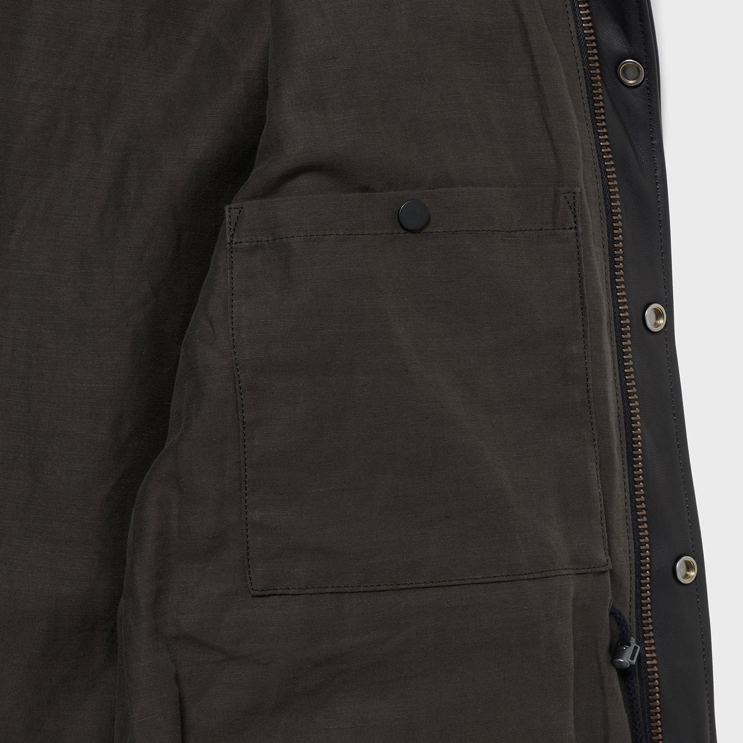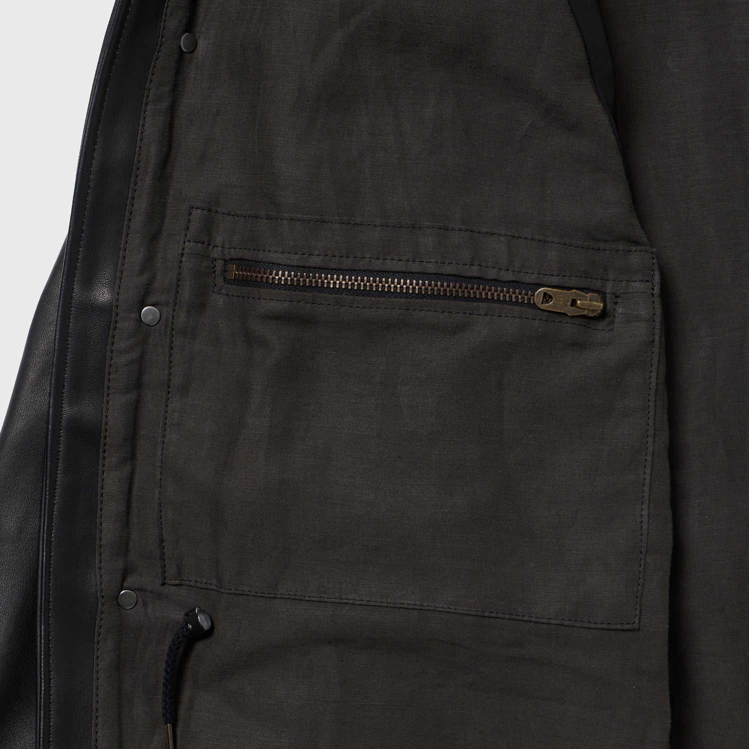 80年代、ゴアテックスが市場に出だしたころ、イギリスで企画されたノースフェイスのマウンテンパーカがあった。フードが外付けで独特で個性的な襟構造をもった1着でそのオリジナル古着からレザーに対応した仕様に修正しながらこの形に行きついた。