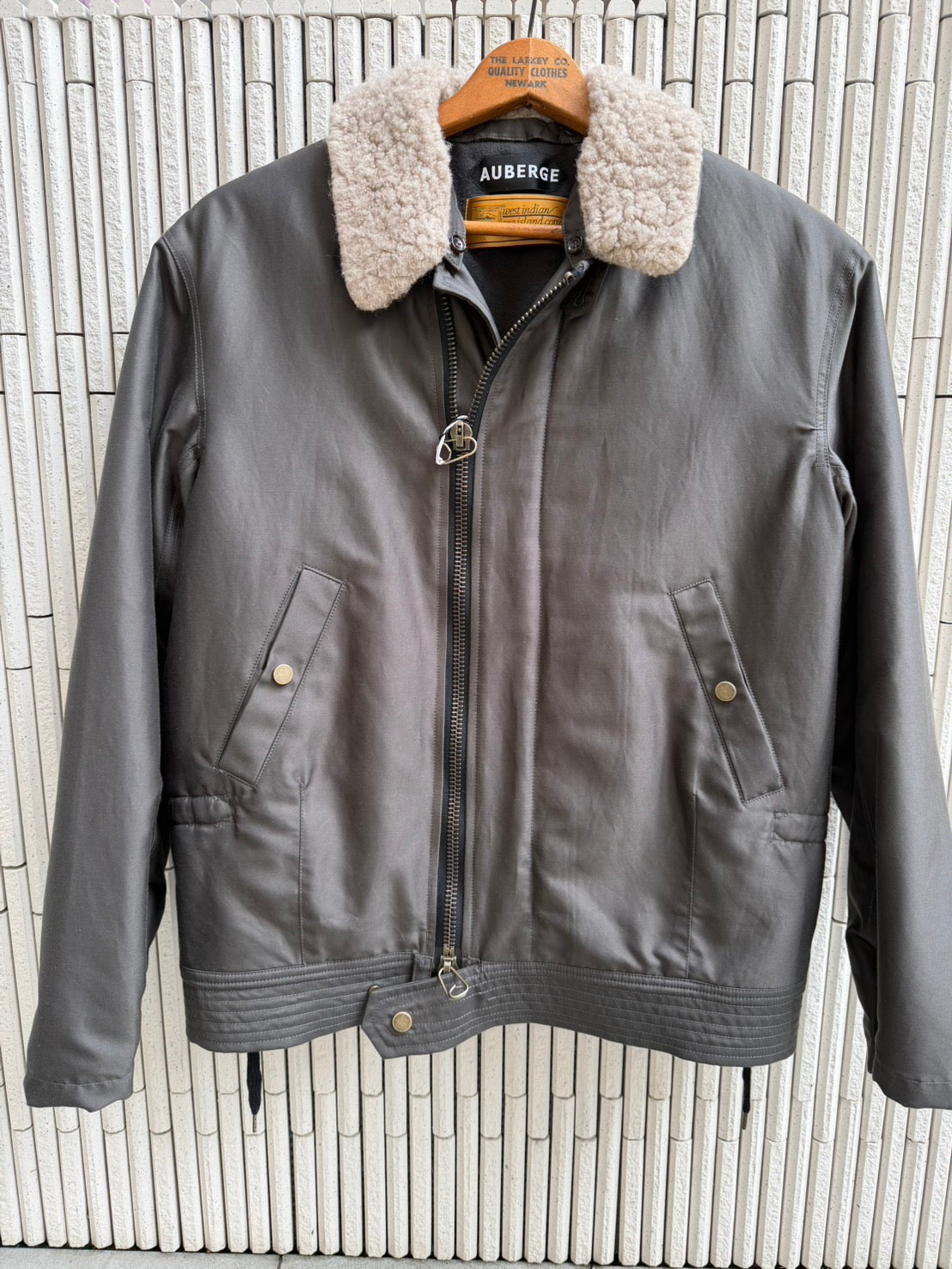 60年代のフランス軍フライトジャケットをベースにデザインしました。オリジナルのコットン生地やファスナーポジションなどから明らかにアメリカ空軍のB15シリーズを研究して作られた感がある1着である。古着のようなマッチョ感を極力薄め、着丈なども着やすく配慮いたしました。襟ボアはウールとヤクのミックスした素材を使用。結果、レギュラーサイジングで仕上がっております。