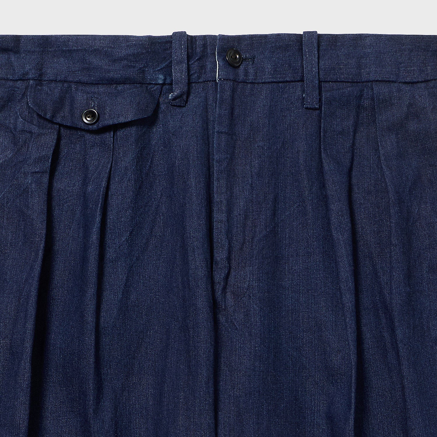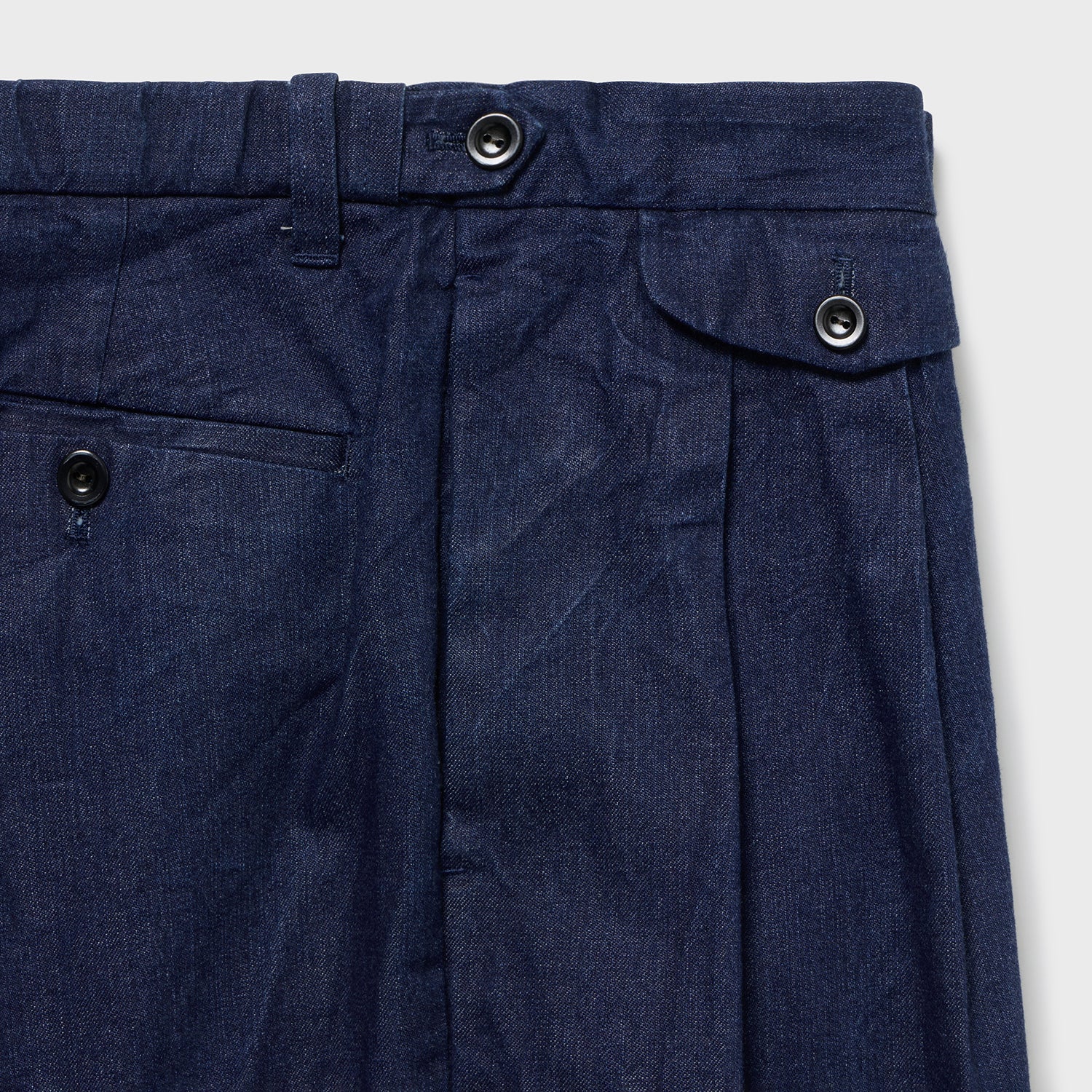 イギリス1940年代製造CC41モデルのスラックスのデットストックを原型に今のサイズ感、シルエットに仕上げました。特徴として後ろベルト部分にエラスティックコードが入りサイドの釦のアジャストで1サイズの調整が可能。戦時中ならではのアイデアか?